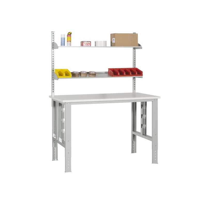 Postazione da lavoro ergonomica ed elevabile in altezza. Con 2 ripiani regolabili ed orientabili. Struttura in lamiera di acciaio spessore 15/10, con innesto a scorrimento interno, traverso e profilo reggitubo. Predisposta per fissaggio a pavimento. Il tubo, diametro 3cm, in acciaio verniciato, è agganciabile a 3 altezze diverse. Piano in laminato sp. 3cm placcato avorio su 1 lato, controbilanciato e bordato in ABS. Montanti posteriori fissati alle fiancate con asolatura e passo mm. 35 per aggancio dei ripiani. N. 2 fori supplementari sulle staffe permettono l'inclinazione del ripiano. Verniciatura a polveri grigio RAL 7038 e piano in laminato avorio. Altezza montanti dal piano 99cm. Dimensioni banco: 150Lx84Px78/115Hcm. Fornito montato.