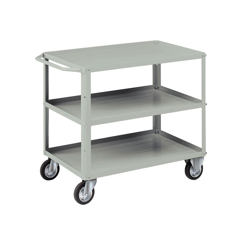 Carrello in lamiera a 3 vasche, ruote 140 con cuscinetti a rulli a rulli, 2 fisse e 2 girevoli. Portata kg.120 ogni vasca. Portata carrello kg.360. Smontato. Verniciatura a polvere grigio RAL 7038.
