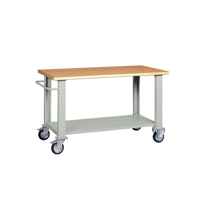 Banco con piano in legno impiallacciato in noce tanganika e bordato in faggio spessore mm. 40 raggio 2, 1 sottopiano sagomato e rinforzato, 1 manico. Struttura grigia RAL 7038. Ruote con cuscinetti diametro 15cm (2 fisse e 2 girevoli frenenti). Dimensioni: 200x75x90cm. Portata 450kg (intesa per carichi uniformemente distribuiti). Fornito smontato.