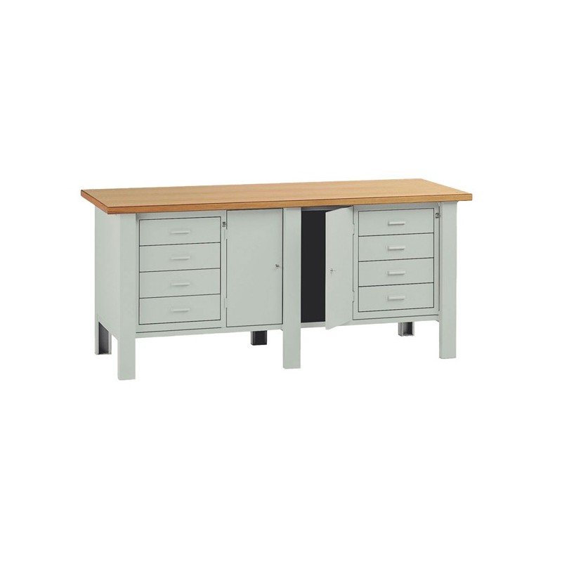 Banco da lavoro con piano in legno impiallacciato in noce tanganika e bordato in faggio spessore mm. 40. Struttura in lamiera pannellata con 3 fiancate, 1 sottopiano sagomato e rinforzato, 2 cassettiere a 4 cassetti scorrevoli su guide con cuscinetti a sfera e serratura con chiusura simultanea, 1 vano centrale con sportelli. Portata kg.1000. Verniciatura a polvere grigio RAL 7038. Dimensioni: 200Lx75Px90Hcm. Fornito smontato. Struttura monoblocco.