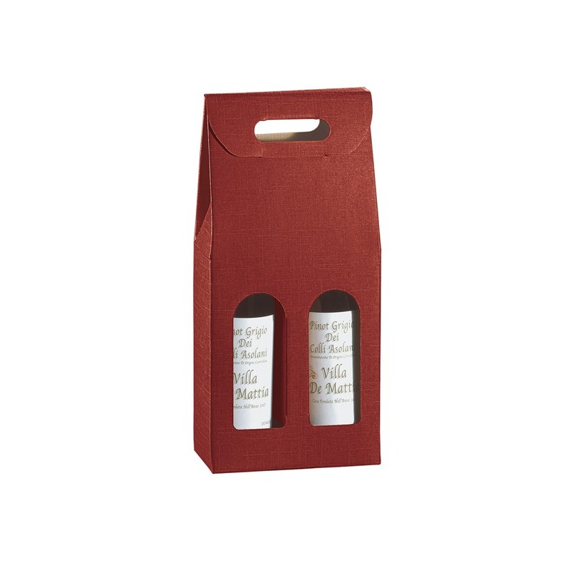 Scatola porta bottiglie in cartone seta colore bordeaux. Adatta per 2 bottiglie e dotata di comoda maniglia per il trasporto. Dimensioni: 18x9x38,5cm.
