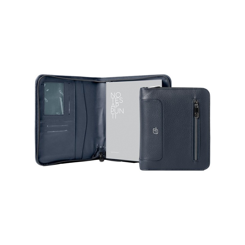Portablocco A5 con zip. Blocco notes verticale A5, scomparti per biglietti, asola porta penne e tasca esterna con zip.