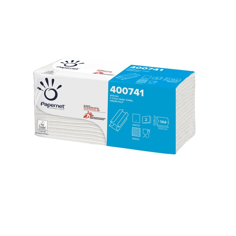 Asciugamani di carta usa e getta Ecolabel Papernet con goffratura ad onda, piegati a C, due veli incollati. Elevata qualità. Formato 33x23cm.