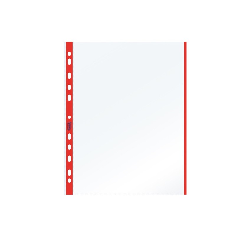 Busta forata con banda rossa realizzata in Naturene (polipropilene) trasparente a buccia d'arancia. Foratura universale con banda di rinforzo e bordo colorato per un'immediata identificazione. Formato 21x29,7cm. Made in Italy