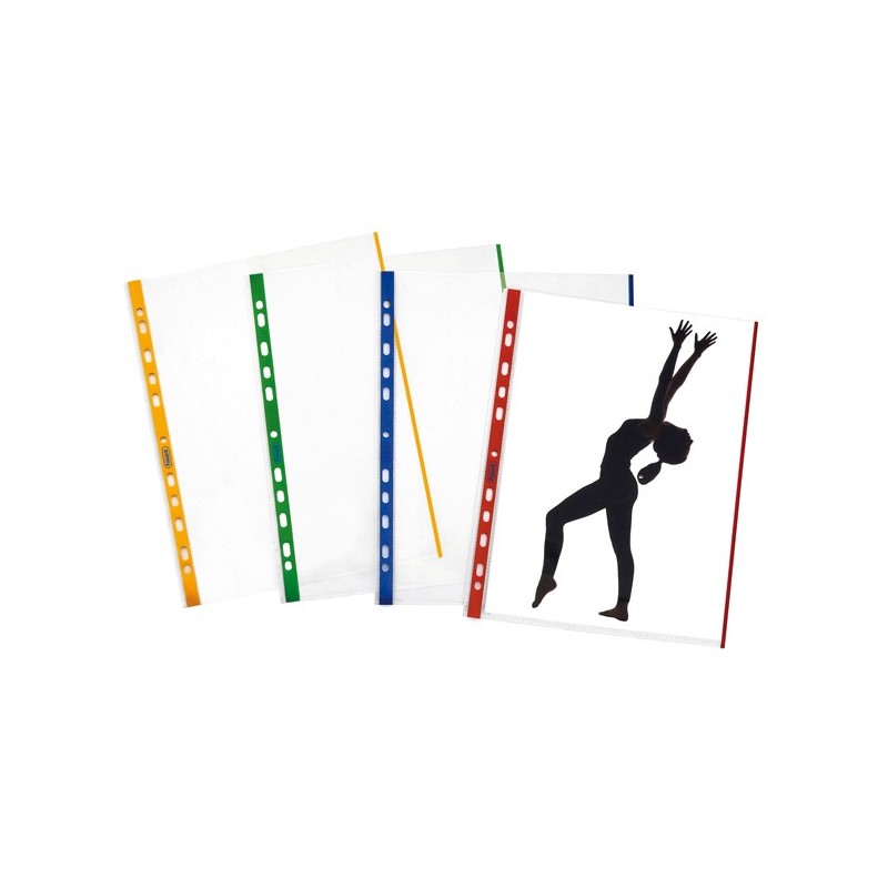 Busta forata con banda blu realizzata in Naturene (polipropilene) trasparente a buccia d'arancia. Foratura universale con banda di rinforzo e bordo colorato per un'immediata identificazione. Formato 21x29,7cm. Made in Italy