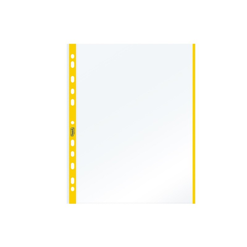 Busta forata con banda gialla realizzata in Naturene (polipropilene) trasparente a buccia d'arancia. Foratura universale con banda di rinforzo e bordo colorato per un'immediata identificazione. Formato 21x29,7cm. Made in Italy