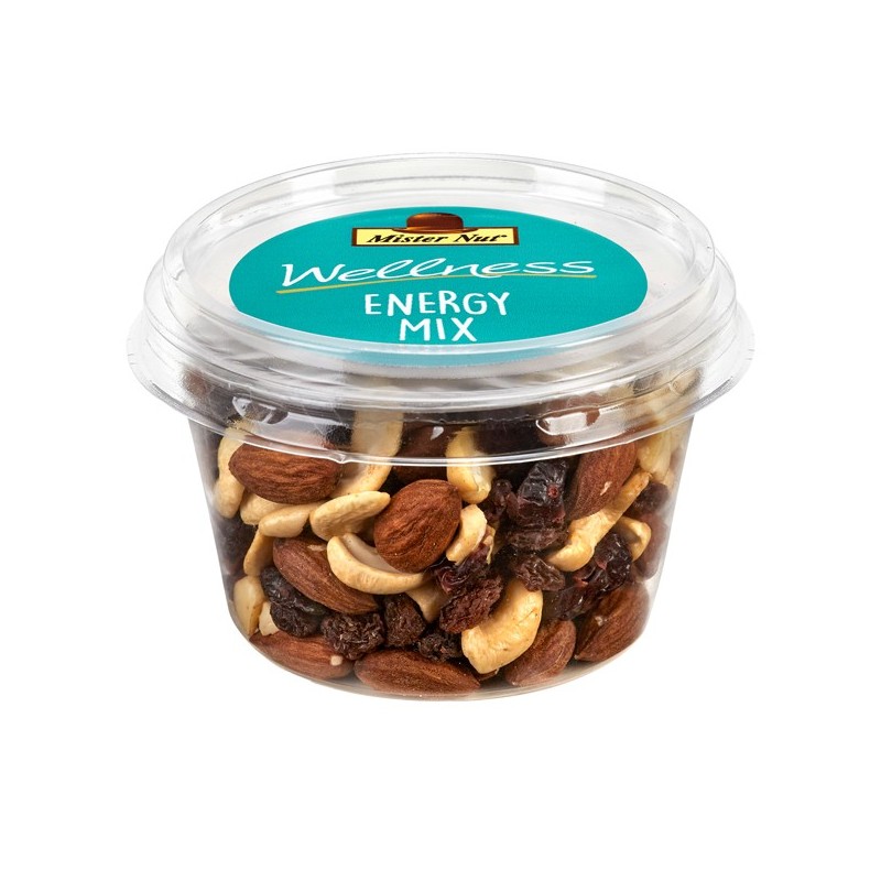 Miscela di frutta disidratata, frutta disidratata zuccherata e frutta secca (Anacardio Sel. + Mandorle Sgusc. + Mirtillo + Uvetta) in pratico bicchiere in plastica R-PET trasparente.