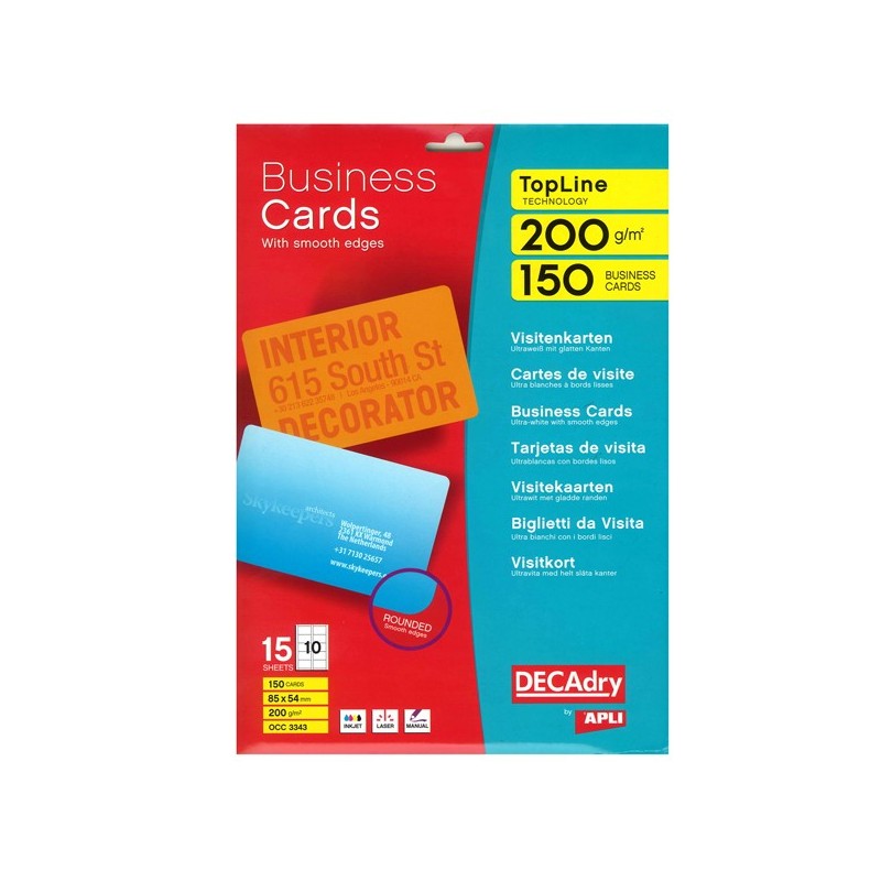 Taschetta contenente 15 fogli di cartoncino bianco da 200gr. Ogni foglio contienen 10 biglietti da visita da 85x54mm pretagliati con angoli arrotondati.