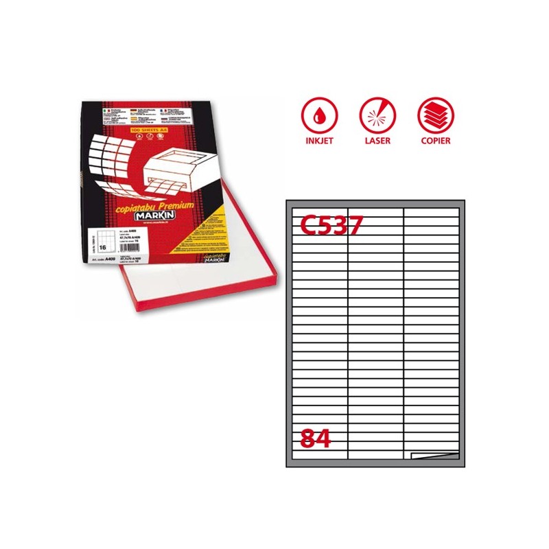 Scatola da 100 fogli di etichette in carta adesiva permanente in formato 21x29,7cm adatti per fotocopiatrici, stampanti laser, inkjet.