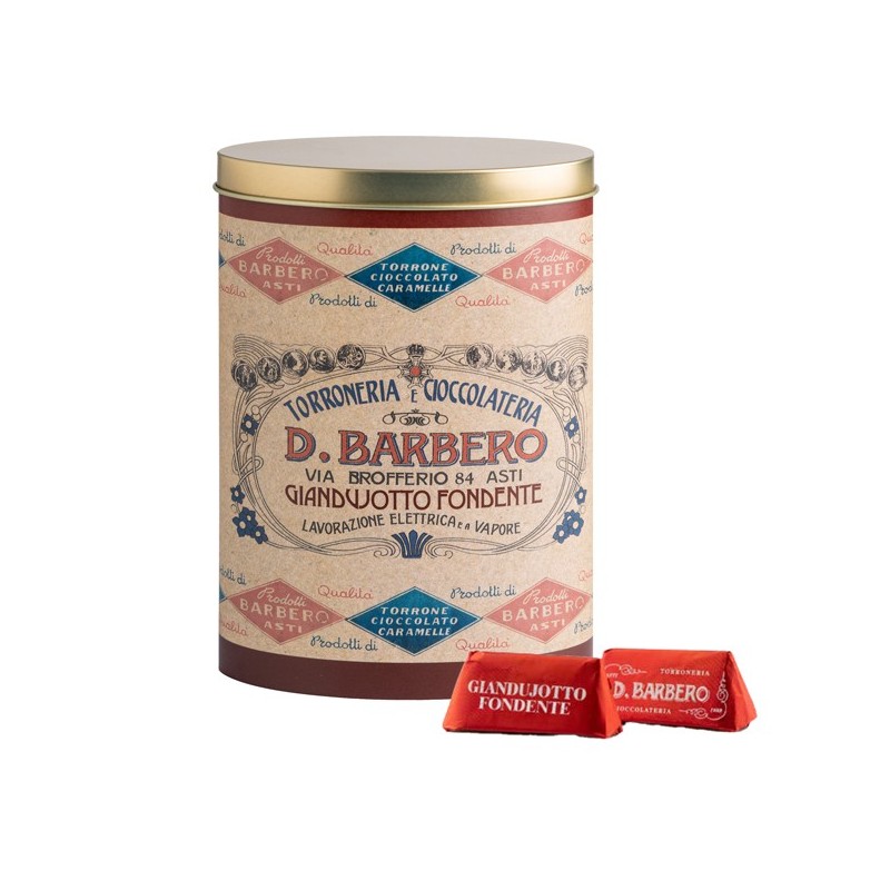 Gianduiotti in elegante scatole di metallo: gusto fondente con cioccolato fondente e cacao per un gusto intenso e aromatico. Mantenere in luogo fresco e asciutto. Temperatura consigliata: 15-18°C.