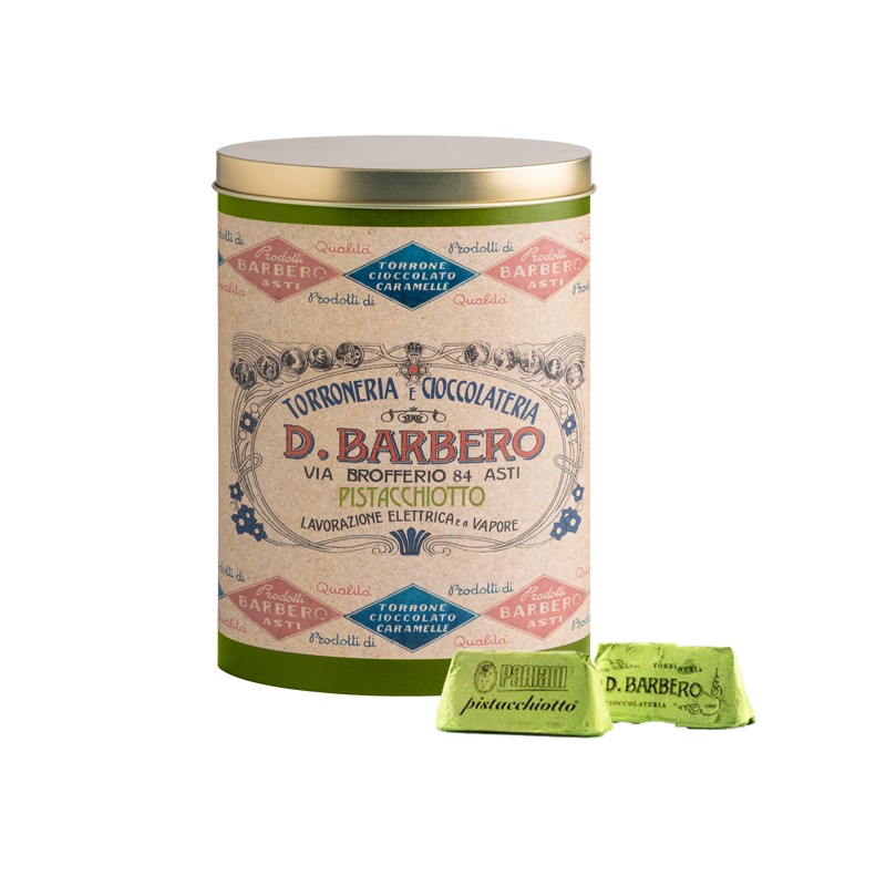 Gianduiotti in elegante scatole di metallo: gusto pistacchio. Mantenere in luogo fresco e asciutto. Temperatura consigliata: 15-18°C.