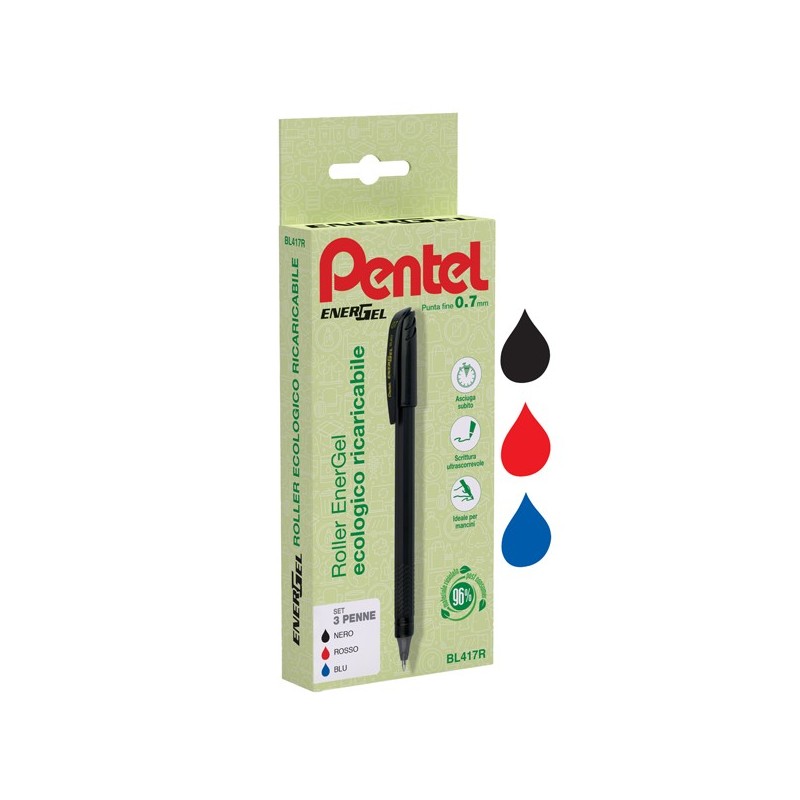 Roller a cappuccio con inchiostro Energel ultrascorrevole ad asciugatura istantanea. Realizzato con il 96% di materiale riciclato post-consumer. Punta 0,7 mm. Ricaricabile con refill LR7. Astuccio 3 colori (nero/rosso/blu).