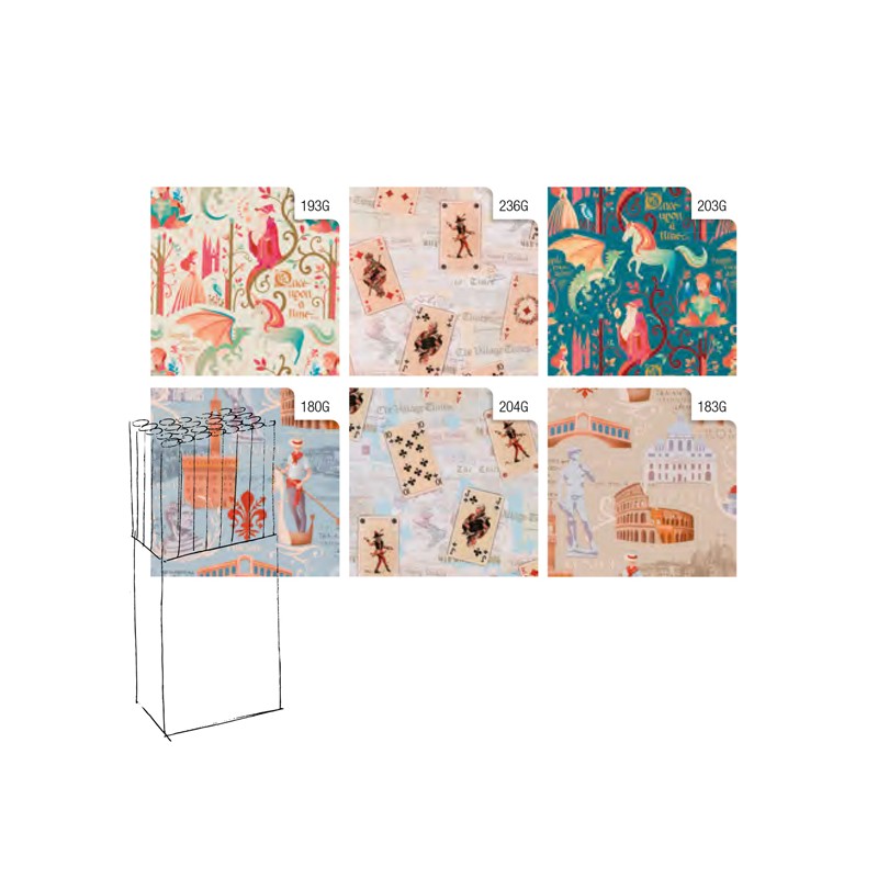 Carta da regalo in rotolo da 70cm x 2metri. Patinata di grammatura superiore extra resistente 75-80gr/m2. Espositore da terra con 6 fantasie assortite.