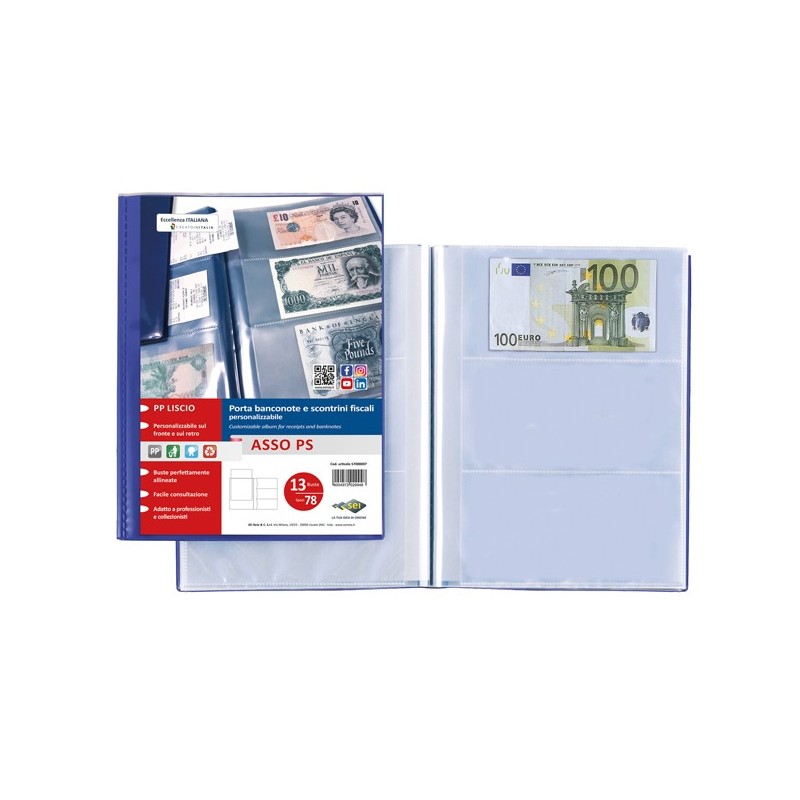 Album in Polipropilene dotato di 13 buste fisse (saldate con sistema brevettato) da 6 tasche ciascuna. Adatto a contenere 78-156 scontrini fiscali (secondo il formato) oppure 78 banconote di vario taglio. Copertina e retro blu sono personalizzabili. Formato esterno: 21x29,7 cm. Formato tasca: 9,5x19 cm.