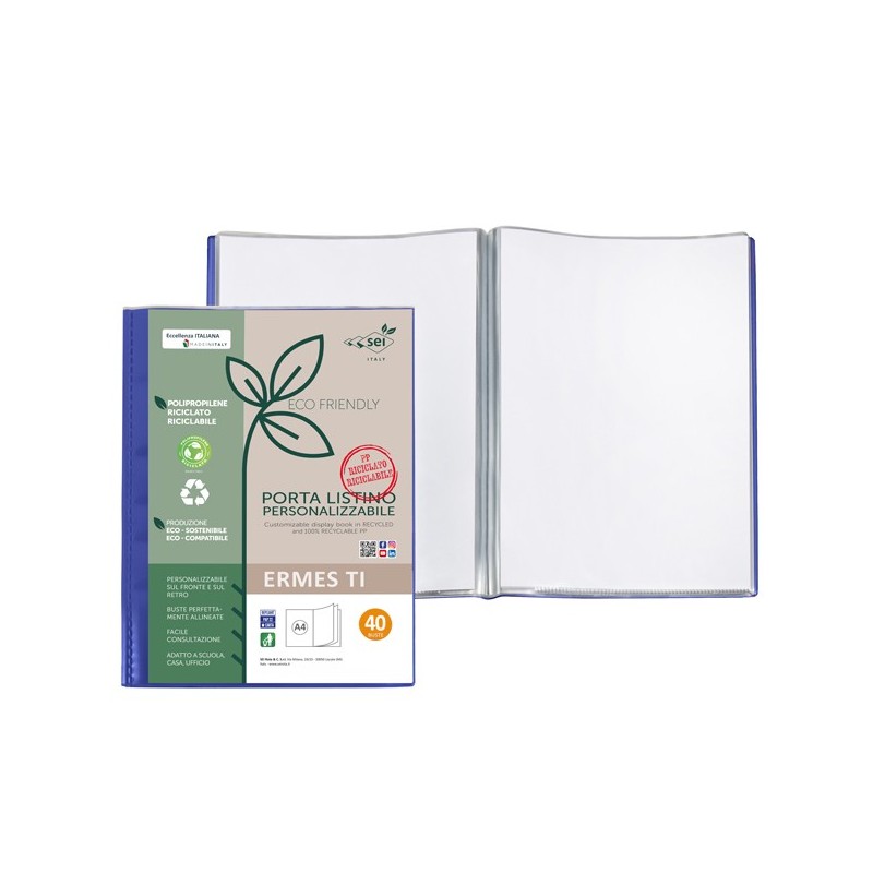 Porta listini personalizzabili GREEN a 20 buste fisse in PP RICICLATO e RICICLABILE. Possibilità di personalizzare sul fronte e sul retro. Copertina colorata.