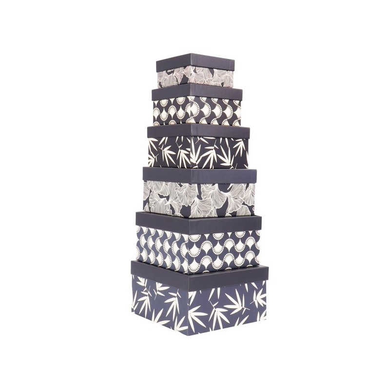 Robuste e colorate scatole in cartone spessore 2mm. Rivestite in carta da 170gr/m2 stampata in offset e incollata a caldo. Il set è composto da 6 scatole, una per ogni misura: 12x12x6cm, 14x14x8cm, 16x16x9cm, 18x18x10cm, 20x20x11cm, 22x22x12cm.