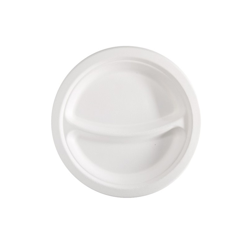 Piatto a due scomparti in fibra di canna da zucchero. Prodotto idoneo al contatto con alimenti secondo il regolamento CE n° 1935/2004 e successivi aggiornamenti. Prodotto conforme ai requisiti della Direttiva 94/62/CE per quanto riguarda il contenuto dei metalli pesanti. Non contiene sostanze sottoposte a restrizioni nelle legislazioni attualmente in vigore sui Food Contact Material. Il prodotto è monouso. Conservare il prodotto in luogo asciutto e lontano da fonti di calore (0°C +35°C). Max 180° per 10 min in forno e max 800W in microonde per 2 min. Utilizzabile in freezer -18°C. Cibi caldi max 90°C per 30min. Max 6 ore a contatto con alimenti.
