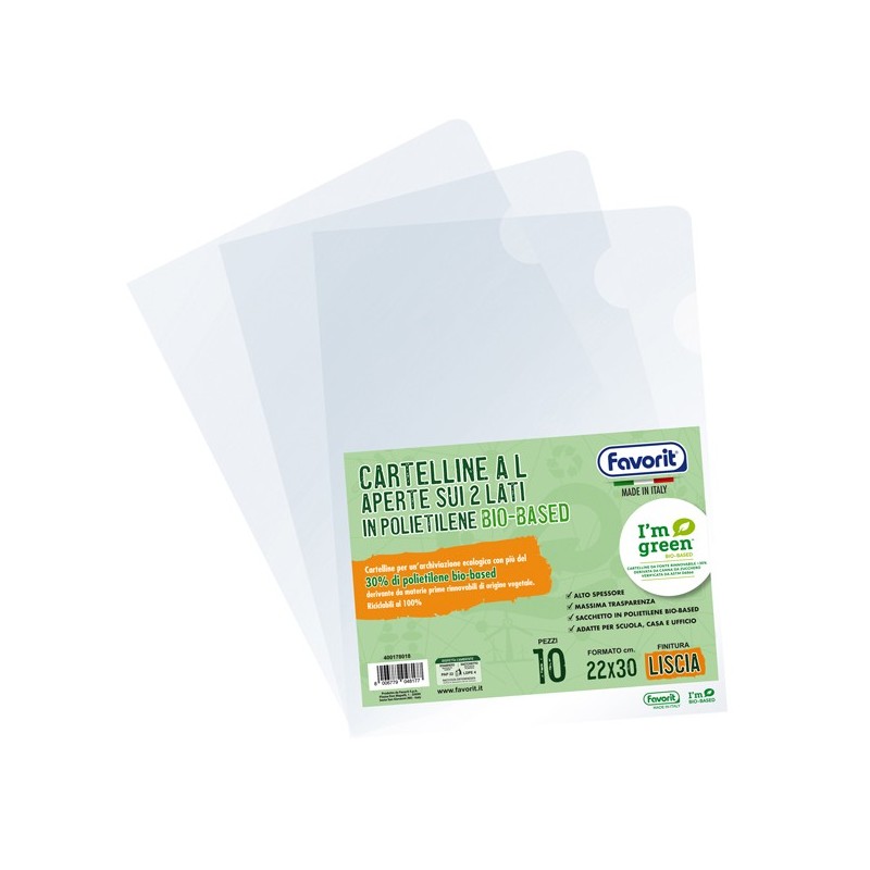 Cartelline a L realizzate in polietilene trasparente con più del 30% di polietilene "I’m green™ bio-based" una materia prima rinnovabile, totalmente riciclabile, la cui produzione deriva dalla lavorazione della canna da zucchero che, rispetto a quella dei polimeri di origine fossile, contribuisce alla riduzione di CO2 nell'atmosfera. L'origine rinnovabile è scientificamente verificata (in laboratorio) secondo il metodo standard ASTM D6866. Amiche dell'ambiente, 100% riciclabili. Aperte sui due lati, finitura Liscia per una massima trasparenza. Elevato spessore che garantisce massima protezione per un utilizzo intensivo. Formato interno 22x30 cm. Confezione da 10 cartelline, anch'essa realizzata in polietilene trasparente con più del 30% a base bio (BIO-BASED).