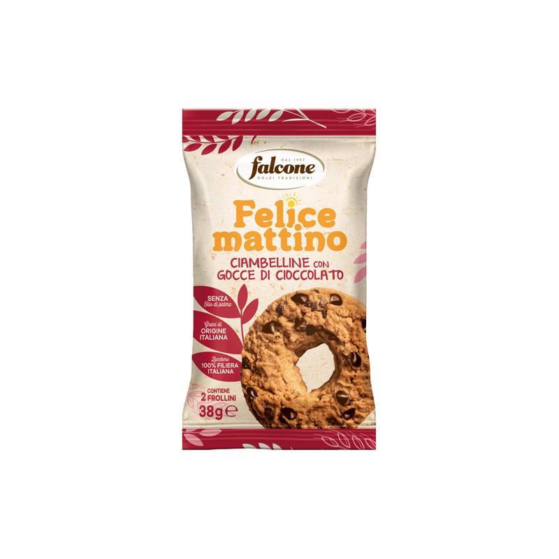 Ciambelline di frolla fragrante con gocce di cioccolato in pratica monoporzione da 2 biscotti (38 gr).