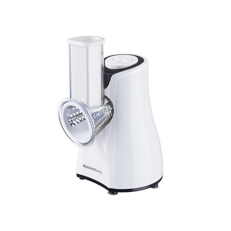 Grattugia elettrica con 5 differenti lame intercambiabili per grattare formaggio e verdure a lamine o a julienne. Dotata di piedini antiscivolo, comodo pulsante a pressione e imboccatura trasparente. Rilascio rapido del cono. Potenza: 200W. Alimentazione: 220 – 240 V AC 50Hz. Dimensione: 16,9x13x24,6cm.