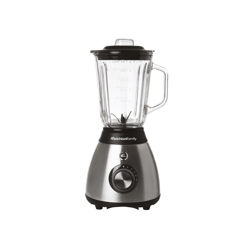 Frullatore elettrico a 5 velocità e funzione Pulse con caraffa in vetro da 1,5L. Dotato di 6 lame in acciaio inossidabile perfette anche per tritare il ghiaccio. Luce LED di funzionamento, base in acciaio e piedini antiscivolo. Coperchio con dosatore per l'aggiunta di ingredienti durante la miscelazione.