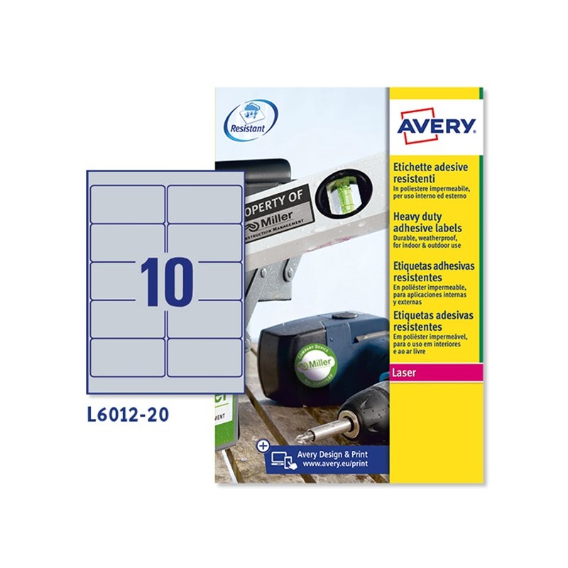 Etichette adesive L6012 - in poliestere - laser - permanenti - 96 x 50,8 mm - 10 et/fg - 20 fogli - argento - Avery