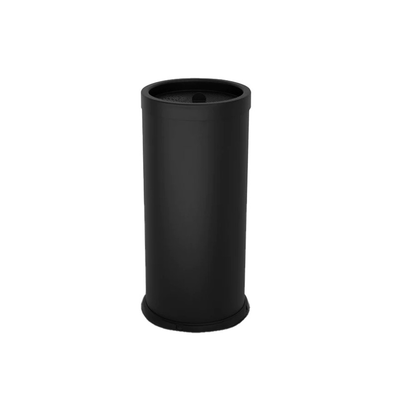 In acciaio verniciato con ghiera superiore nera. Griglia spegni sigaretta rimovibile per permettere la pulizia e lo svuotamento. Un sacchetto di sabbia da 1kg incluso. Anello in plastica inferiore salva pavimento. Si consiglia l'utilizzo in esterno coperto, ad esempio sotto una tettoia.