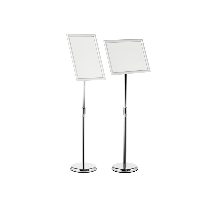 Espositore da pavimento facile da assemblare con robusta cornice a scatto in alluminio anodizzato. Per un'elevata stabilità consigliamo di riempire la base (diametro: 250 mm) con la sabbia. La base rotonda con rivestimento in gomma che previene la formazione di graffi sul pavimento. Altezza regolabile grazie all'asta telescopica (regolabile in step da un'altezza minima di 770cm a un massimo di 120,5cm). La cornice può essere facilmente ruotata dal formato verticale a quello orizzontale. Angolo di lettura regolabile tramite giunto sferico. Foglio di protezione resistente ai raggi UV e antiriflesso. Pannello posteriore in polistirene antiurto.