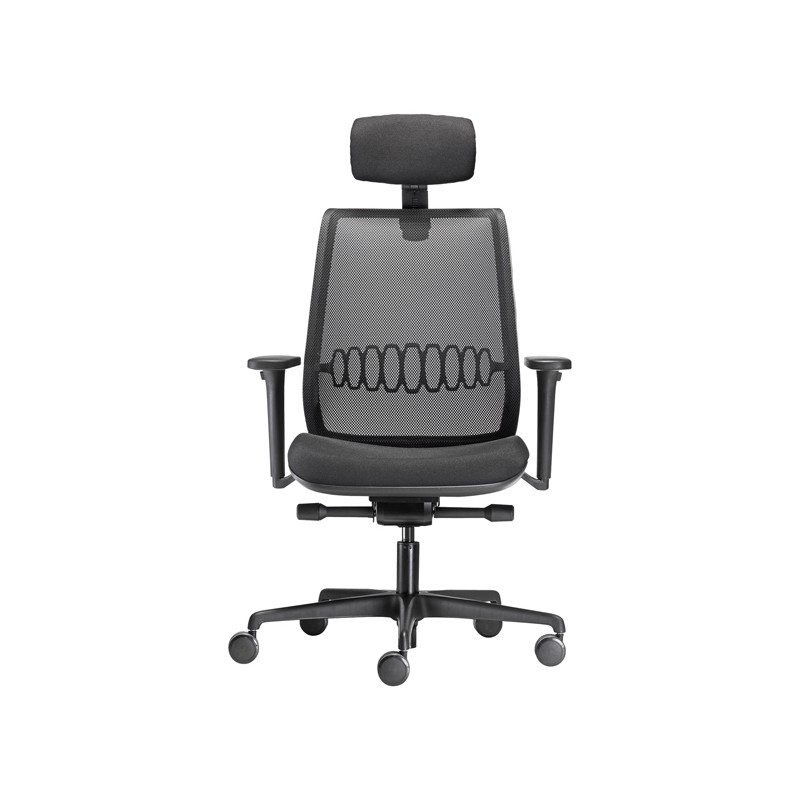 Seduta girevole su ruote operativa, con schienale in rete, elevazione a gas e supporto lombare regolabile meccanismo synchro con anti shock - schienale regolabile in altezza. Braccioli e poggiatesta inclusi.
