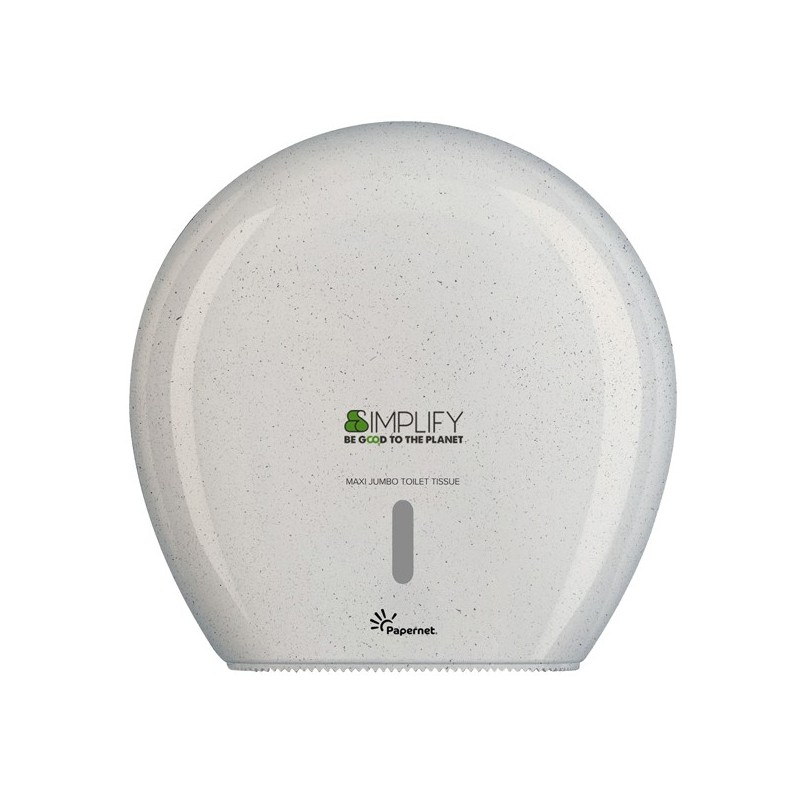 Dispenser Simplify per carta igienica Maxi Jumbo (cod. 421333) realizzato per il 75% da materiale plastico post-consumo e materiali in eccesso proveniente dalla lavorazione del legno, al fine di garantire una riduzione degli sprechi nel rispetto dell'ambiente. Dispenser interamente riciclabili. Design pulito ed elegante, realizzato con materiali antiurto per maggiore praticità.