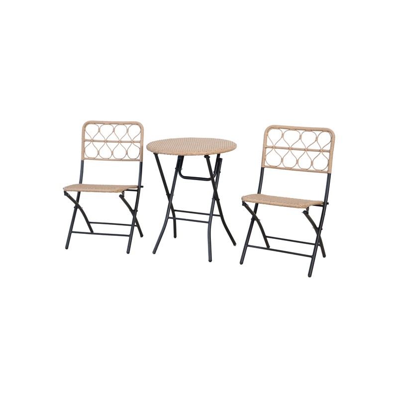 Set da 3 pezzi (2 sedie + 1 tavolo). Struttura in acciaio verniciato nero. Seduta e schienale in polyrattan color naturale. Portata seduta: 150kg; portata tavolo: 30kg. Tavolo e sedie pieghevoli. Set composto da: 1 tavolo tondo 60 x 60 x H72cm, 2 sedie L53 x P47 x H84cm.