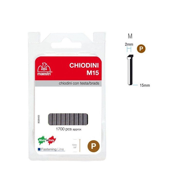 Blister appendibile contenente 1700 chiodini con testa da 2mm per fissatrice da 15mm di lunghezza. Utilizzabili con Sparapunti Rocama 14 (tutti i modelli) e Rocama 16 (mod. 116 B e 53.16B).