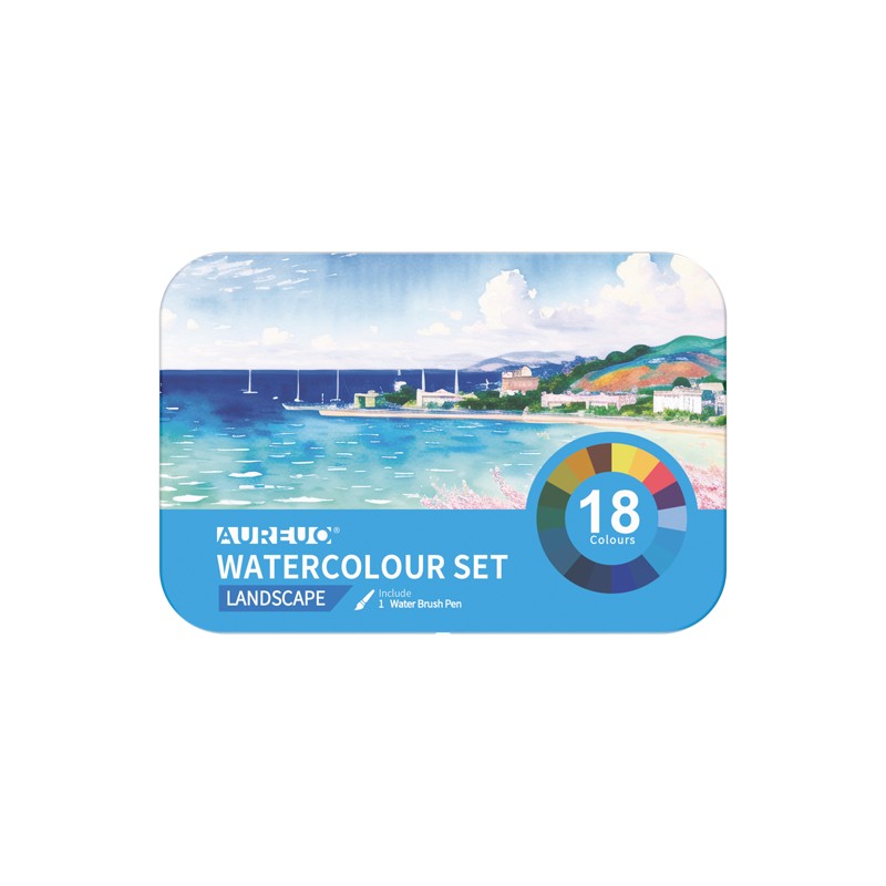 Set 18 pastiglie + pennello brush forniti in pratico scatola in metallo. Colori paesaggi.