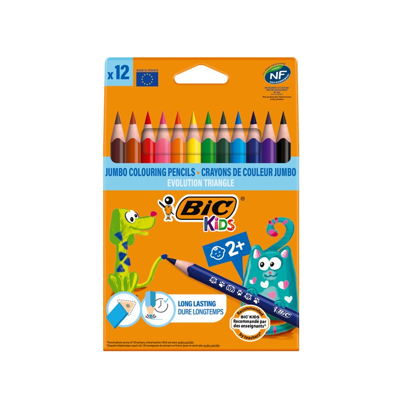 Matite in resina senza legno. Facili da temperare. Non fanno schegge se spezzate. Mina ultraresistente. Difficili da rosicchiare. Colori brillanti. Fornite in astuccio in cartone appendibile. Fusto triangolare ampio per la primissima infanzia (con 55% di materiale riciclato e certificazione ecologica NF Environmenti).