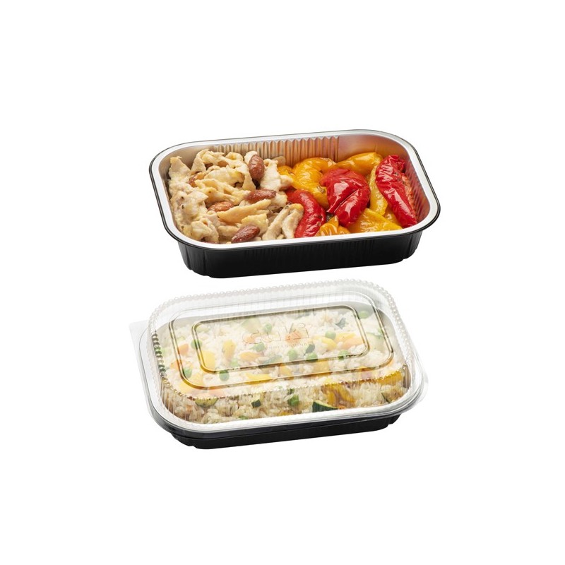 Contenitori in alluminio stirato laccati neri con coperchio trasparente in R-Pet ( con oltre 45% di PET riciclato ottenuto da macinato di bottiglie di plastica post-consumo). Idonei per forno tradizionale ed microonde grazie all'elevata rigidità, conducibilità e resistenza meccanica/termica. Contenitore da 2 porzioni - 22x15x4,4cm.