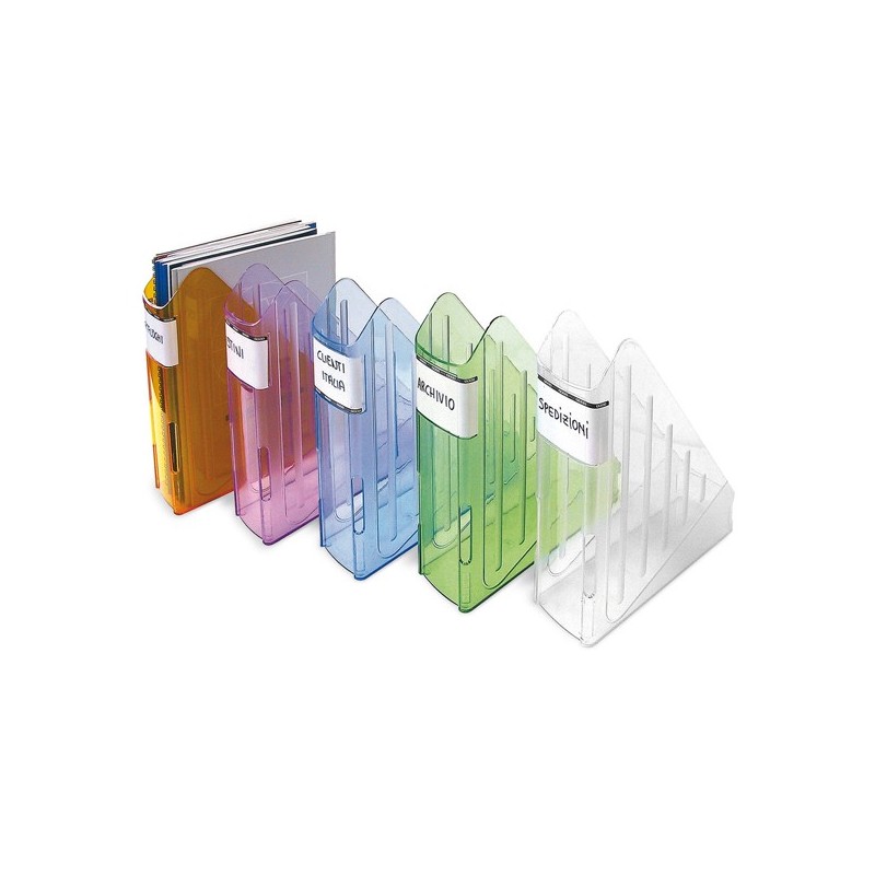 Portariviste Transparent Colors materiale antiurto molto resistente. Grazie alla profondità maggiorata rispetto allo standard può contenere anche formati extra. Sede per applicare etichette identifi cative su entrambi i lati. Pratico e funzionale. Dimensioni: 29,5x27cm - dorso 7,5cm.