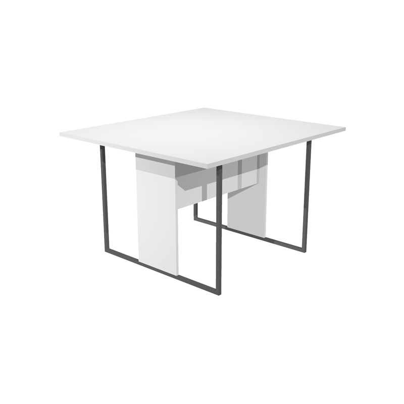 Desktop in melaminico bilaminato sp.22mm. 2 modesty panel strutturali in melaminico bilaminato H35cm (sp.18mm). Gambe ad anello in metallo a sezione quadrata 20x20mm verniciate a polveri epossidiche complete di piedini regolabili iin altezza e montante strutturale in melaminico bilaminato di larghezza 30cm (spessore 18mm). Larghezza gamba 90cm. Tavolo riunione L120xP110xH74,4cm