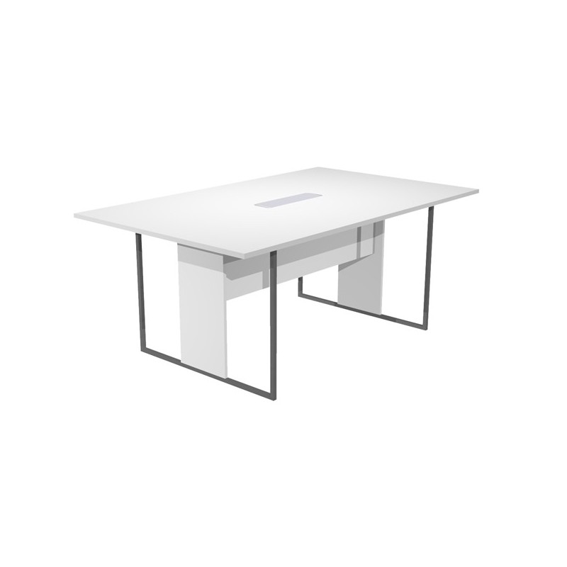 Desktop in melaminico bilaminato sp.22mm. 2 modesty panel strutturali in melaminico bilaminato H35cm (sp.18mm). Gambe ad anello in metallo a sezione quadrata 20x200mm verniciate a polveri epossidiche complete di piedini regolabili in altezza e montante strutturale in melaminico bilaminato di larghezza 30cm (spessore 18mm). Larghezza gamba 90cm. Tavolo riunione con top access L180xP110xH74,4cm