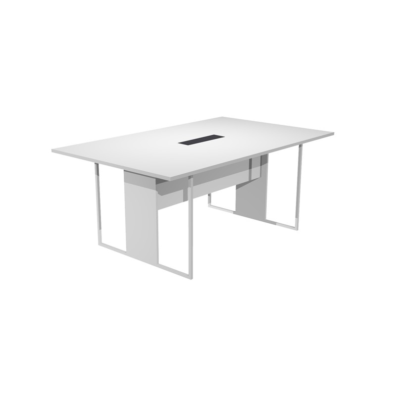 Desktop in melaminico bilaminato sp.22mm. 2 modesty panel strutturali in melaminico bilaminato H35cm (sp.18mm). Gambe ad anello in metallo a sezione quadrata 20x200mm verniciate a polveri epossidiche complete di piedini regolabili in altezza e montante strutturale in melaminico bilaminato di larghezza 30cm (spessore 18mm). Larghezza gamba 90cm. Tavolo riunione con top access L180xP110xH74,4cm