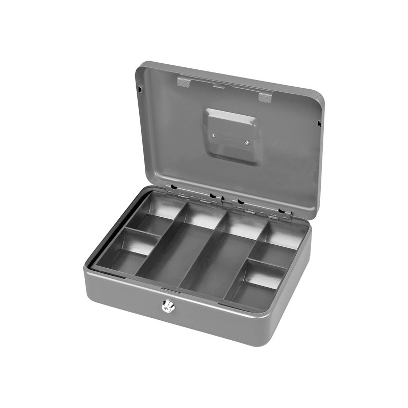 Cassetta portavalori Serie Secur in lamiera verniciata a polvere epissodica. Maniglia in acciaio nichelato incassata sul coperchio. Colore grigio. Serratura a chiave.