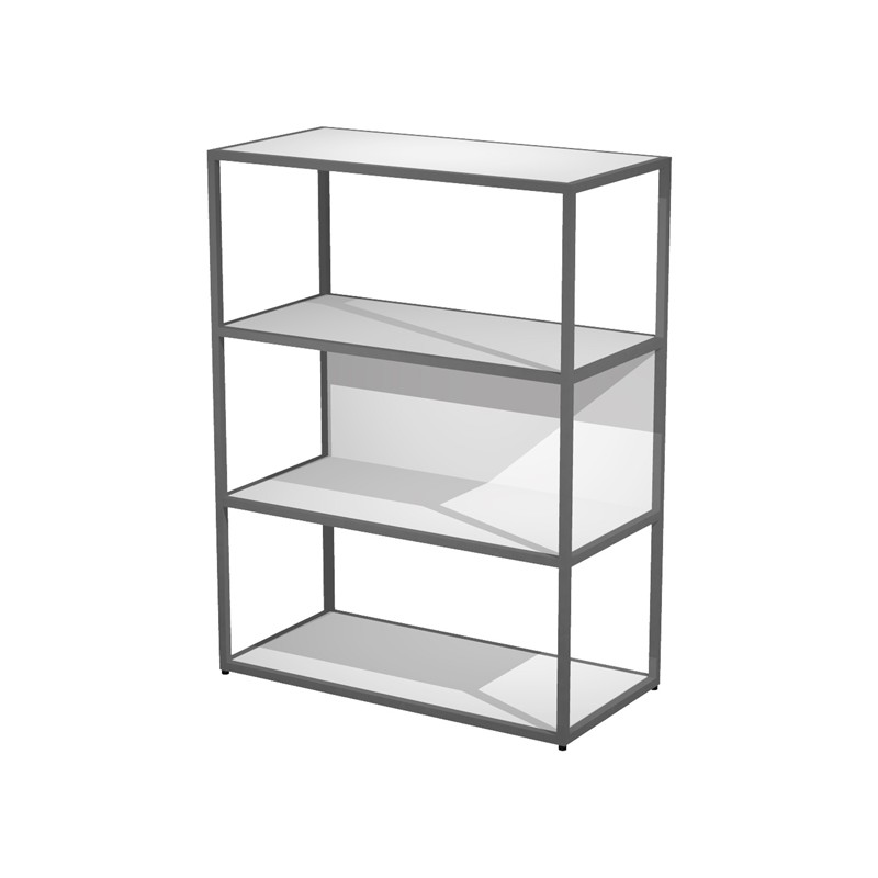 Librerie in metallo con struttura a sezione quadrata 20x20mm verniciate a polvere epossidica. Ripiani, base dietro e top in melaminico (il dietro può essere posizionato a scelta in qualsiasi vano). Le librerie possono essere installate a terra (kit di montaggio compreso con piedini regolabili in altezza) oppure possono essere allestite in sovrapposizione agli armadi). Libreria in metallo a 2 vani con struttura 20x20 mm, a giorno con ripiani, base, cappello e un dietro in melaminico (la schiena in melaminico è riposizionabile a scelta in fase di montaggio) - piedini regolabili in altezza. Dimensioni: 90x44xH119cm.