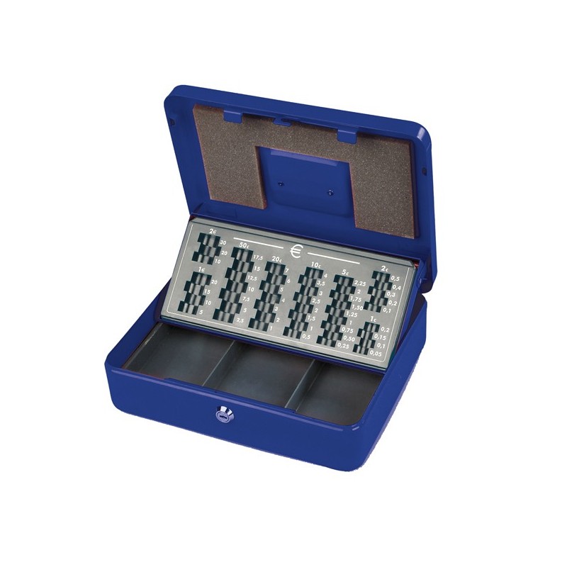 Cassetta portavalori Serie Europa in lamiera verniciata a polvere epissodica. Interno con vaschetta portamonete e comparti portabanconote. Maniglia in acciaio nichelato incassata sul coperchio. Colore blu. Serratura a chiave cifrata. Dimensioni: 30x24x9cm.