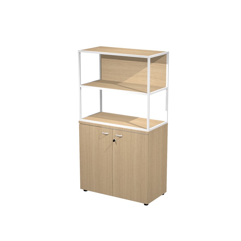 Libreria in metallo a 2 vani con struttura 20x20 mm a giorno con ripiani, base, cappello e un dietro in melaminico , sovrapposta ad un armadio basso, completo di ante battenti con serratura. Libreria metal completa di 1 dietro in melaminico posizionabile a scelta in fase di montaggio. Dimensioni: 90x46xH165cm