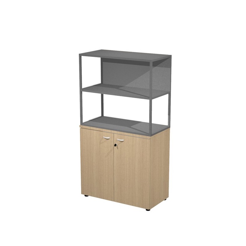 Libreria in metallo a 2 vani con struttura 20x20 mm a giorno con ripiani, base, cappello e un dietro in melaminico , sovrapposta ad un armadio basso, completo di ante battenti con serratura. Libreria metal completa di 1 dietro in melaminico posizionabile a scelta in fase di montaggio. Dimensioni: 90x46xH165cm