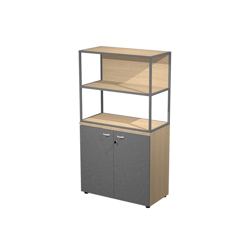 Libreria in metallo a 2 vani con struttura 20x20 mm a giorno con ripiani, base, cappello e un dietro in melaminico , sovrapposta ad un armadio basso, completo di ante battenti con serratura. Libreria metal completa di 1 dietro in melaminico posizionabile a scelta in fase di montaggio. Dimensioni: 90x46xH165cm