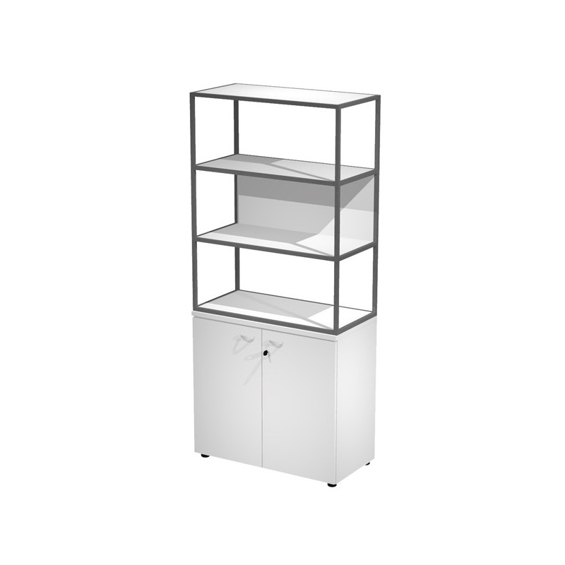 Libreria in metallo a 3 vani con struttura 20x20 mm a giorno con ripiani, base, cappello e un dietro in melaminico , sovrapposta ad un armadio basso, completo di ante battenti con serratura. Libreria metal completa di 1 dietro in melaminico posizionabile a scelta in fase di montaggio. Dimensioni: 90x46xH204cm