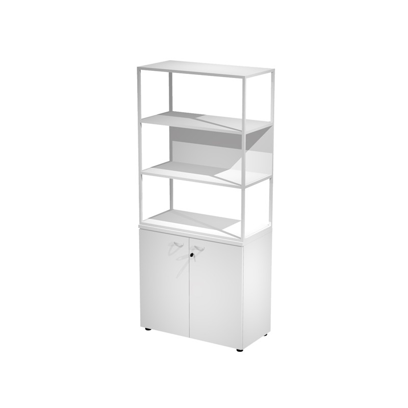 Libreria in metallo a 3 vani con struttura 20x20 mm a giorno con ripiani, base, cappello e un dietro in melaminico , sovrapposta ad un armadio basso, completo di ante battenti con serratura. Libreria metal completa di 1 dietro in melaminico posizionabile a scelta in fase di montaggio. Dimensioni: 90x46xH204cm