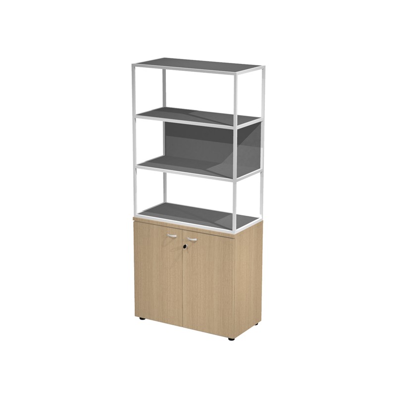 Libreria in metallo a 3 vani con struttura 20x20 mm a giorno con ripiani, base, cappello e un dietro in melaminico , sovrapposta ad un armadio basso, completo di ante battenti con serratura. Libreria metal completa di 1 dietro in melaminico posizionabile a scelta in fase di montaggio. Dimensioni: 90x46xH204cm Colore mobile rovere / colore ante rovere / colore mensole antracite / struttura bianca
