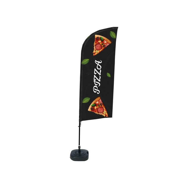 Per interno ed esterno pronta all'uso. Completa di base riempibile ad acqua. Stampa ignifuga classificazione B1 su tessuto ecologico riciclato. Palo in alluminio diametro 28 mm. Per interno ed esterno. Dimensioni vela: 89x240cm.