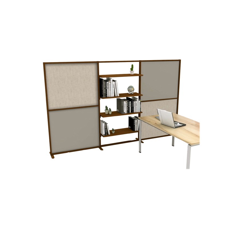 Parete divisoria autoportante con elemento ripiani, che divide gli spazi e crea più privacy. Può essere posizionato dove si desidera. Modulo centrale con n.4 ripiani in laminato finitura lino cancun. Con quattro pannelli in laminato nei colori: 2 lino cancun e 2 grigio cera. Questi colori tenui rendono la libreria adatta anche per ambienti casalinghi, studi medici, cliniche e uffici. Facile da posizionare e da pulire. Dimensioni: L307cm x H 180,5cm. Parete premontata, solo base e piani da fissare.